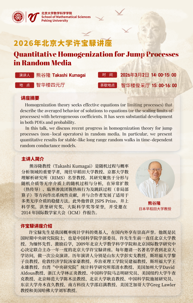 演讲人介绍:熊谷隆教授(Takashi Kumagai)是随机过程与概率分析领域的重要学者,现任早稻田大学教授、京都大学数理解析研究所(RIMS)名誉教授。其研究聚焦于分形与随机介质等无序介质上的随机过程与分析,在异常扩散(热传导)、临界渗流团簇热核行为及跳跃过程(非局部算子)等方向作出系统性贡献,并与合作者发展了适用于多类无序介质的稳健方法。此外他曾获 JSPS Prize、井上科学奖、洪堡研究奖、大阪科学奖等荣誉,并受邀在 2014 年国际数学家大会(ICM)作报告。