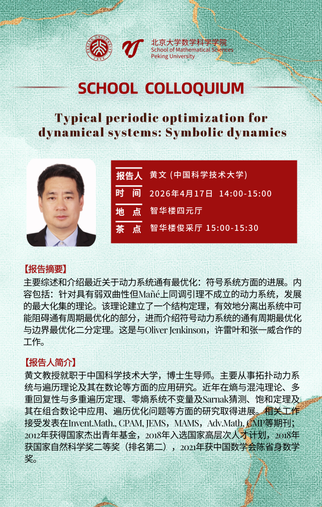 黄文教授就职于中国科学技术大学,博士生导师。主要从事拓扑动力系统与遍历理论及其在数论等方面的应用研究。近年在熵与混沌理论、多重回复性与多重遍历定理、零熵系统不变量及Sarnak猜测、饱和定理及其在组合数论中应用、遍历优化问题等方面的研究取得进展。相关工作接受发表在Invent.Math., CPAM, JEMS,MAMS,Adv.Math, CMP等期刊;2012年获得国家杰出青年基金,2018年入选国家高层次人才计划,2018年获国家自然科学奖二等奖(排名第二),2021年获中国数学会陈省身数学奖。