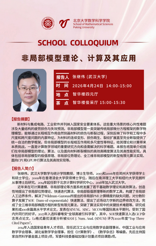 新材料与集成电路、工业软件并列纳入国家安全要素体系。这些重大场景的核心共性难题涉及大量结构的疲劳损伤与失效预测。非局部模型是一类突破传统局部微分方程框架的数学物理模型,能够通过长程相互作用自然刻画材料的损伤与断裂过程,深刻反映了科学和工程中多尺度和跨尺度问题的内禀特征,为材料的连续变形、损伤萌生、裂纹扩展直至完全断裂提供了统一自洽的数学框架。但非局部模型的长程相互作用和多尺度性等特征,给其理论和计算带来本质挑战,一直是计算数学领域的重要研究方向和亟需解决的科学难题。本报告将简单介绍我们在非局部模型的理论、算法、以及面向材料断裂模拟的高效高精度算法及其高性能实现。具体包括非局部模型的极值原理、非局部位势理论、全三维非局部模型的新型有限元算法实现、面向CPU和GPU并行算法及其高效实现等。
