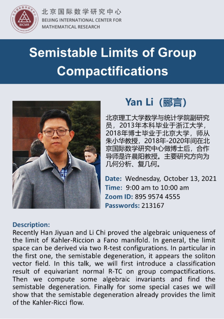 Abstract: Recently Han Jiyuan and Li Chi proved the algebraic uniqueness of the limit of Kahler-Riccion a Fano manifold. In general, the limit space can be derived via two R-test configurations. In particular in the first one, the semistable degeneration, it appears the soliton vector field. In this talk, we will first introduce a classification result of equivariant normal R-TC on group compactifications. Then we compute some algebraic invariants and find the semistable degeneration. Finally for some special cases we will show that the semistable degeneration already provides the limit of the Kahler-Ricci flow.