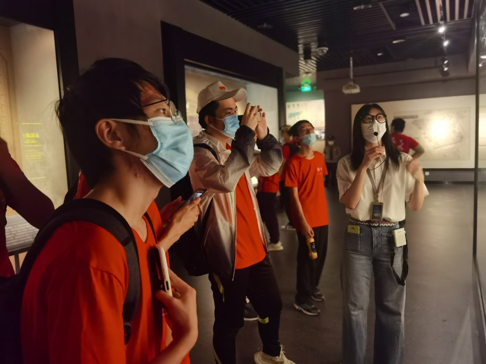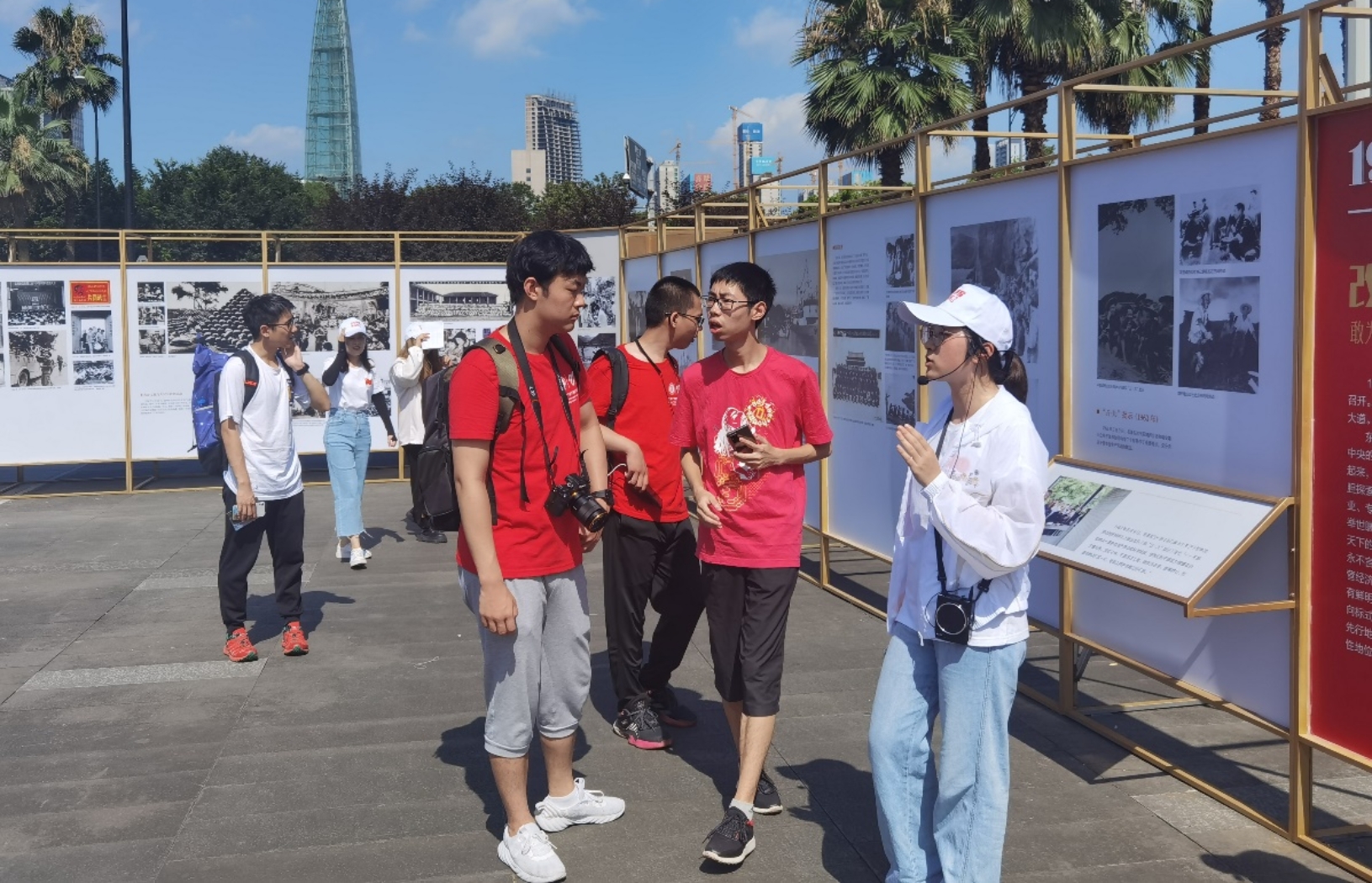 讲解员向同学们介绍图片展背后的故事